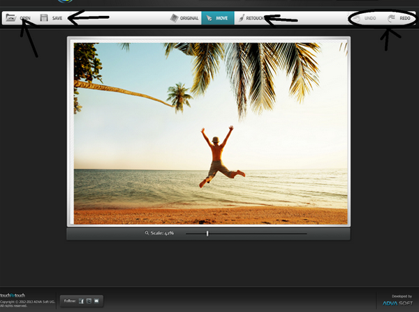 باستخدام أداة "Retouch" في الاعلى يمكنك ان تشرع في ازالة الاشياء الغير المرغوب فيها ."Move" تمكن من تحريك الصورة في الاتجاه التي تريده.